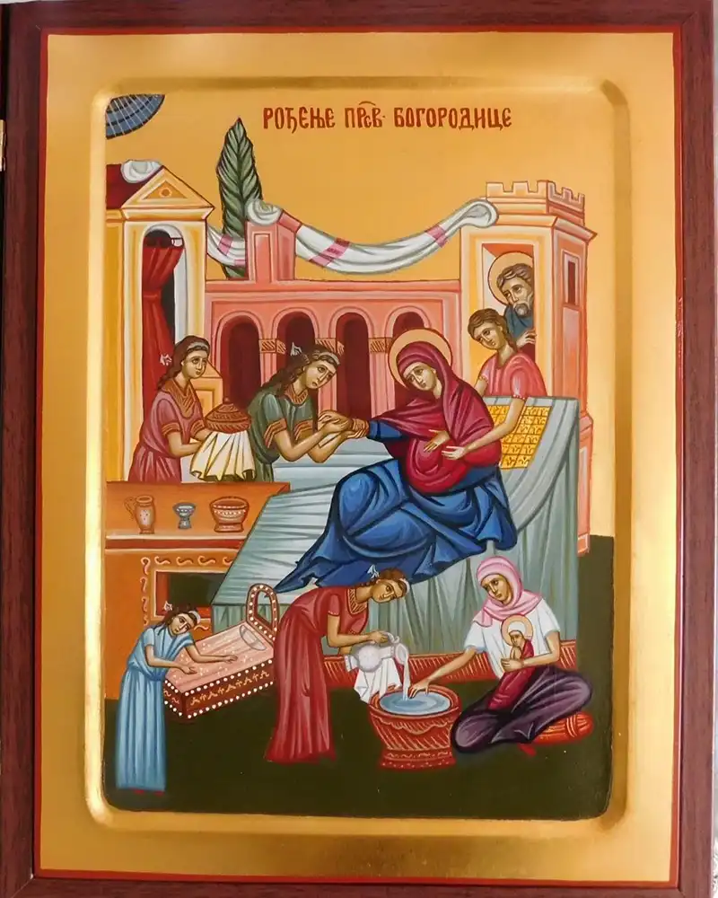 Света Дјева Марија роди се од старих родитеља својих, Јоакима и Ане. Отац јој беше из племена Давидова, а матер од рода Аронова. И тако она беше по оцу од рода царска, а по мајци од рода архијерејска и тиме већ предображаваше Онога, који ће се из ње родити, као Цара и Првосвештеника. Њени родитељи беху већ остарели, а немаху деце. И зато беху постидни пред људима и скрушени пред Богом. И у скрушености својој мољаху се Богу с плачем, да обрадује старост њихову даровањем једнога чеда, као што је некад обрадовао старца Аврама и старицу Сару даровавши им сина Исака. И Бог свемогући и свевидећи обрадова их радошћу, која је превазилазила далеко сва њихова очекивања и све најлепше снове. Јер им дарова не само ћерку но и Богомајку; озари их не само радошћу временом него и вечном. Даде им Бог само једну ћерку, која им доцније роди само једног унука, – али какву ћерку и каквог унука! Благодатна Марија, благословена међу женама, храм Духа Светога. олтар Бога Живога, трапеза хлеба небеснога, кивот светиње Божје, дрво најслађега плода, слава рода људског, похвала рода женског, источник девства и чистоте – то беше Богом дарована ћерка Јоакима и Ане. Рођена у Назарету, а после 3 године одведена у храм Јерусалимски, одакле се вратила опет у Назарет, да ускоро чује благовест св. архангела Гаврила о рођењу Сина Божјег, Спаситеља света, из њенога пречистога и девичанскога тела.